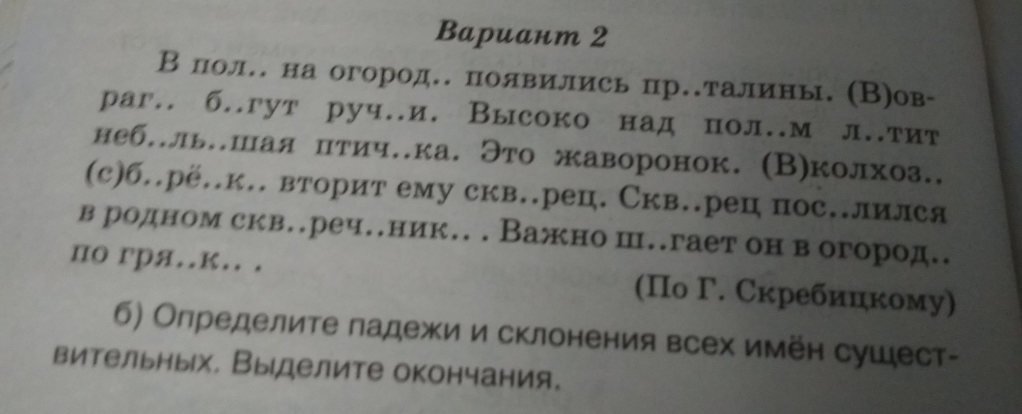 помогите пожалуйста а)Спишите.Вставьте пропущенные буквы и знаки препинания б)Определите падежи и склонения всех имён существительных.Выделите окончания.