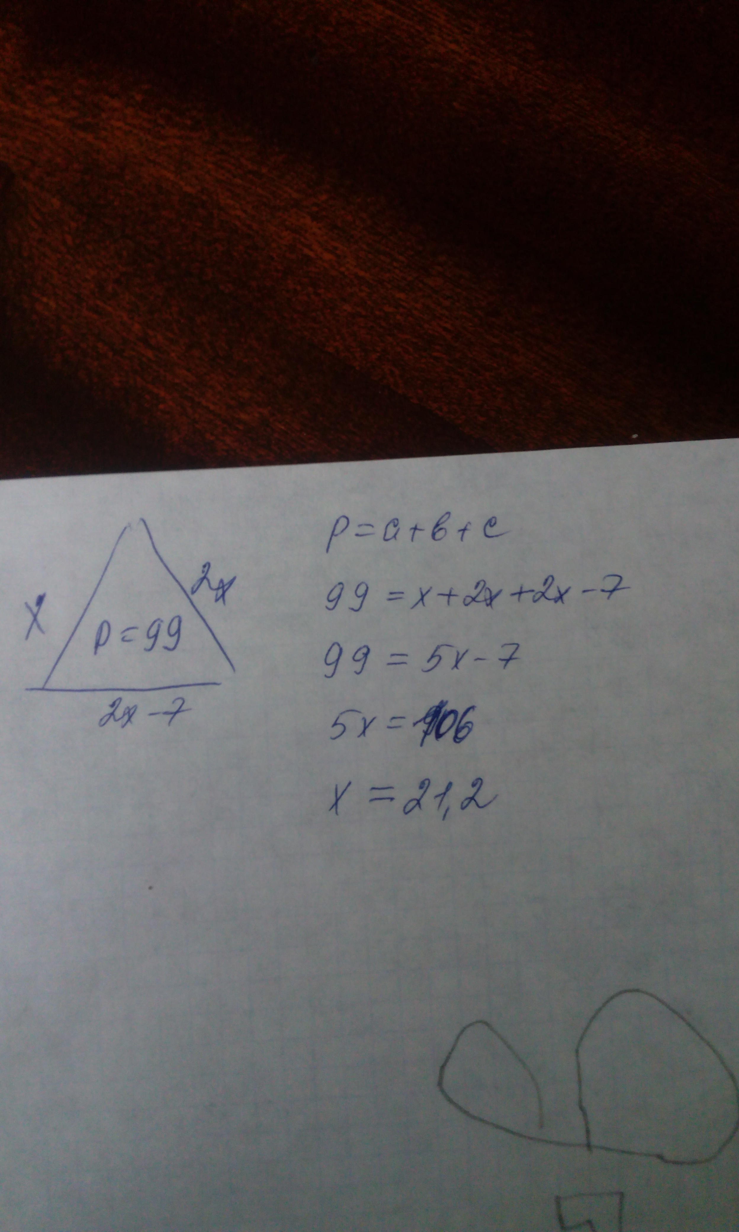 Одна из сторон треугольника в 2 раза больше второй стороны , а вторая-на 7 дм меньше третьей. Найди стороны треугольника , если его периметр равен 99 дм