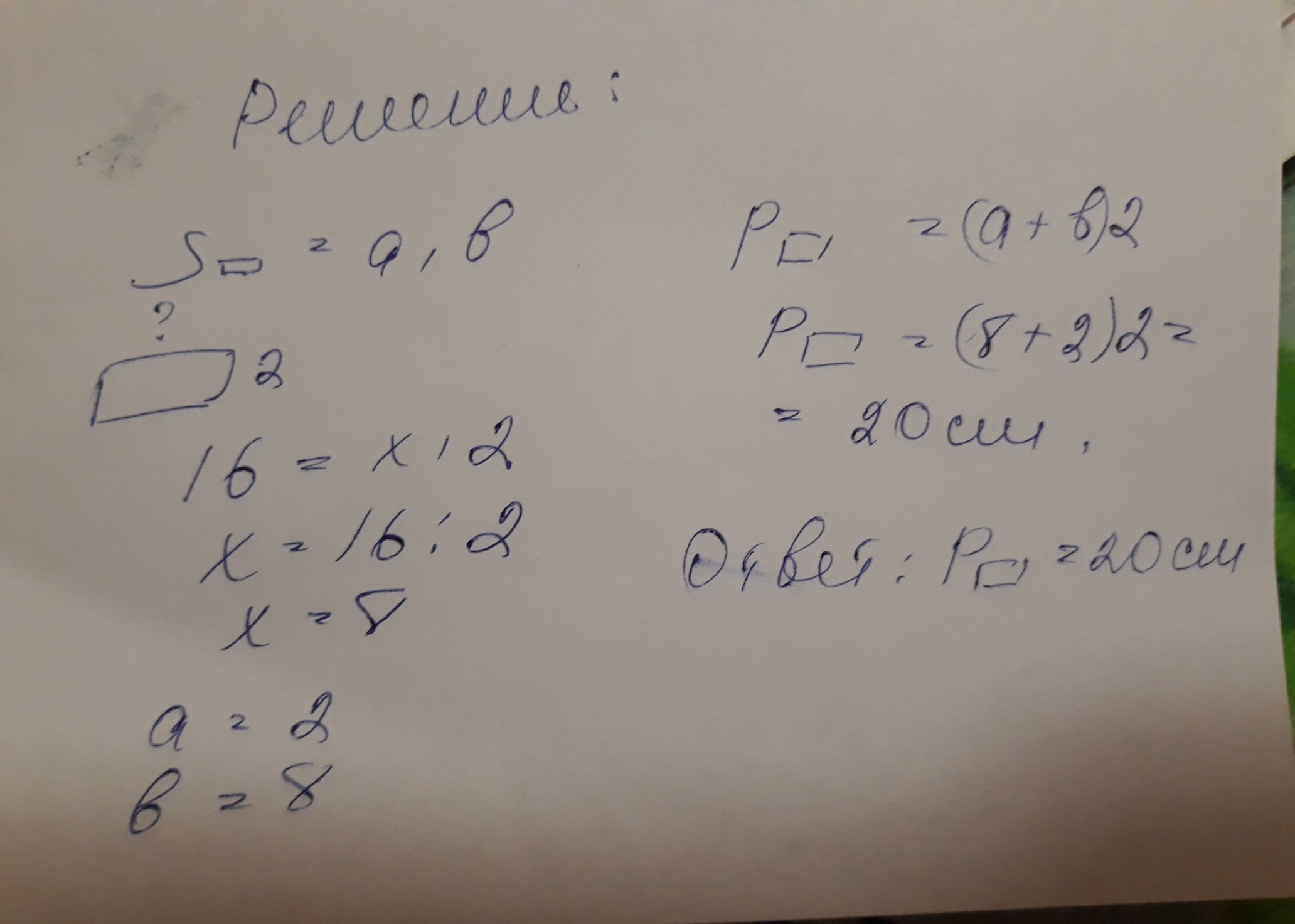 Помогите решить задачу. Площадь прямоугольника равна 16 как.см. Одна из его сторон равна 2 см. Чему равен периметр прямоугольника? Спасибо большое за ранее