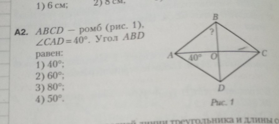 50 градусов тк угол а равен 80 (диагонали ромба делят угол пополам и ромб это четерех угольник в котором все стороны равны значит абд равнобедренный (180-80)/2-=50