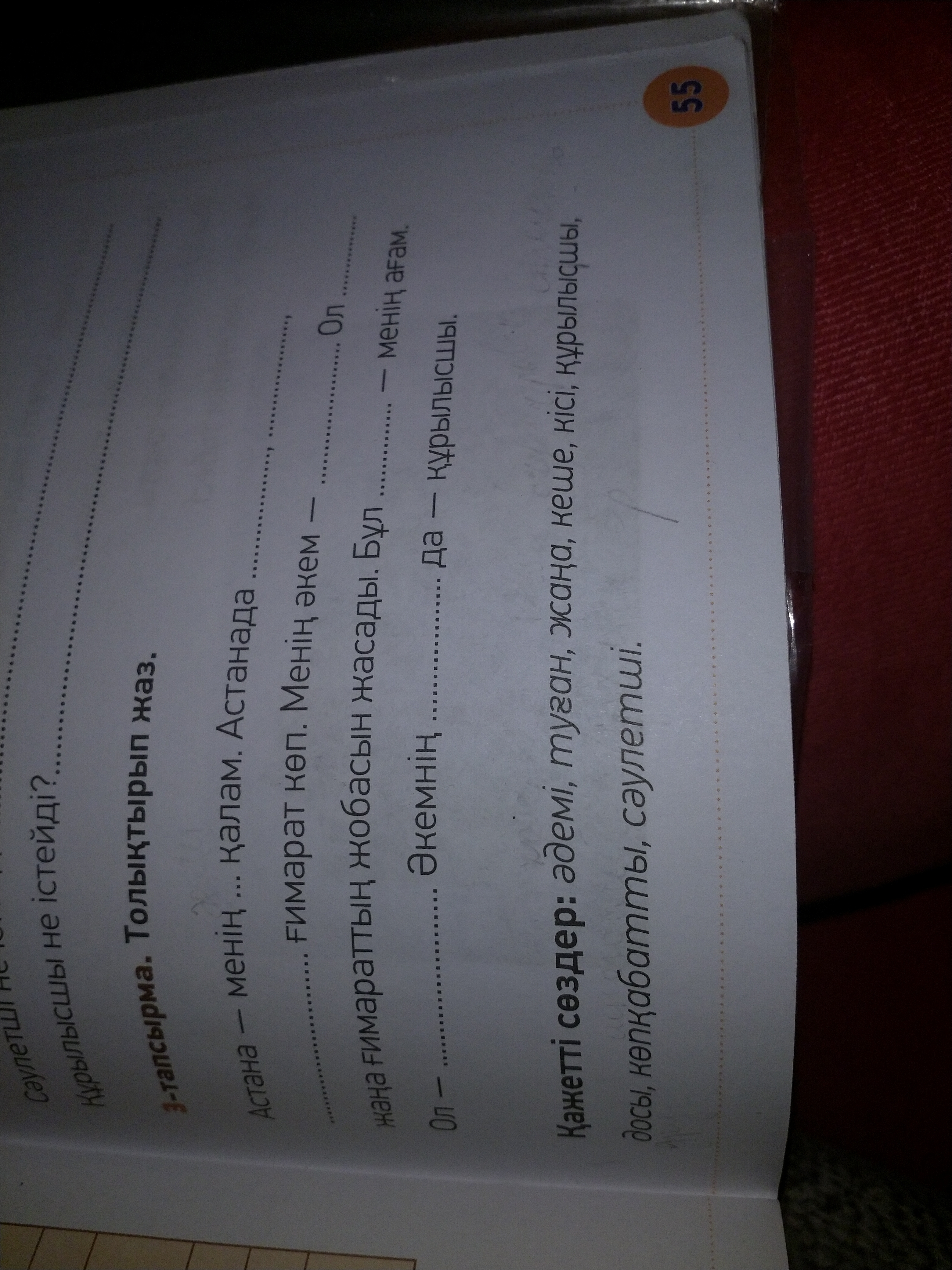 Астана-менің әдемі қалам. Астанада көп қабатты жаңа ғимарат көп. Менің әкем - сәулетші. Ол кеше жаңа ғимараттың жобасын жасады. Бұл кісі - менің ағам. Ол - құрылысшы. Әкемнің досы да - құрылысшы.