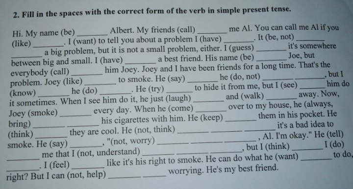 Now , Joey SMOKES every day. when he COMES over to my house , he ALWAYS BRINGS his cigarettes with him. he KEEPS them in this pocket . he THINKS they are cool . he DOESN'T THINK it's a bad idea to smoke . he SAYS " DON'T WORRY al. i´m okay" he TELLS me that i DON'T UNDERSTAND, but i THINK I DO.
