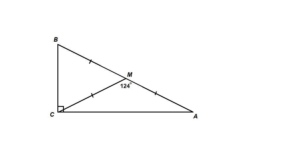 в прямоугольном треугольнике ABC am медиана опущенная на гипотенузу AB Найдите величину большего острого угла если угол amc равен 124 градуса