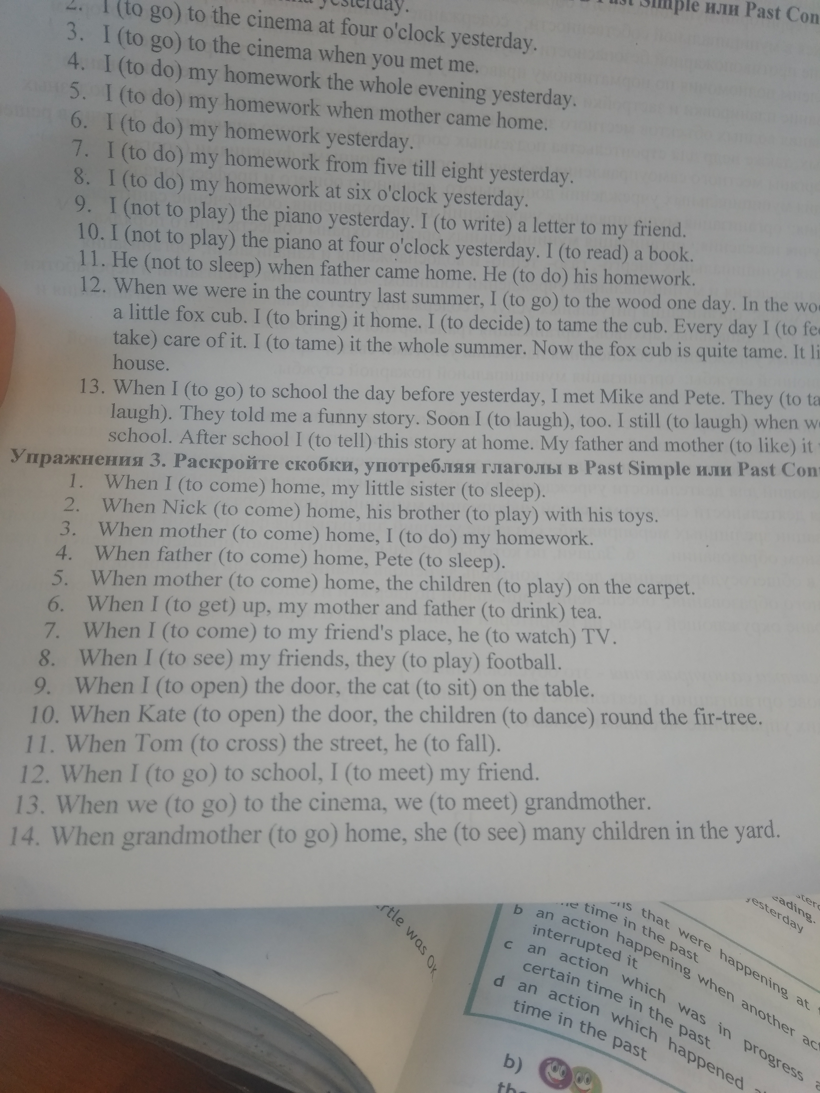 1. When I came home, my little sister was sleeping. 2. When Nick came home, his brother was playing with his toys. 3. When mother came home, I was doing my homework. 4. When father came home, Pete was sleeping. 5. When mother came home, the children were playing on the carpet. 6. When I got up, my mother and father were drinking tea. 7. When I came to my friend's place, he was watching TV. 8. When I saw my friends, they were playing football. 9. When I opened the door, the cat was sitting on the table. 10. When Kate opened the door, the children were dancing round the fir-tree. 11. When Tom was cross the street, he fell. 12. When I was going to school, I met my friend. 13. When we were going to the cinema, we met grandmother. 14. When grandmother was going home, she saw many children in the yard.