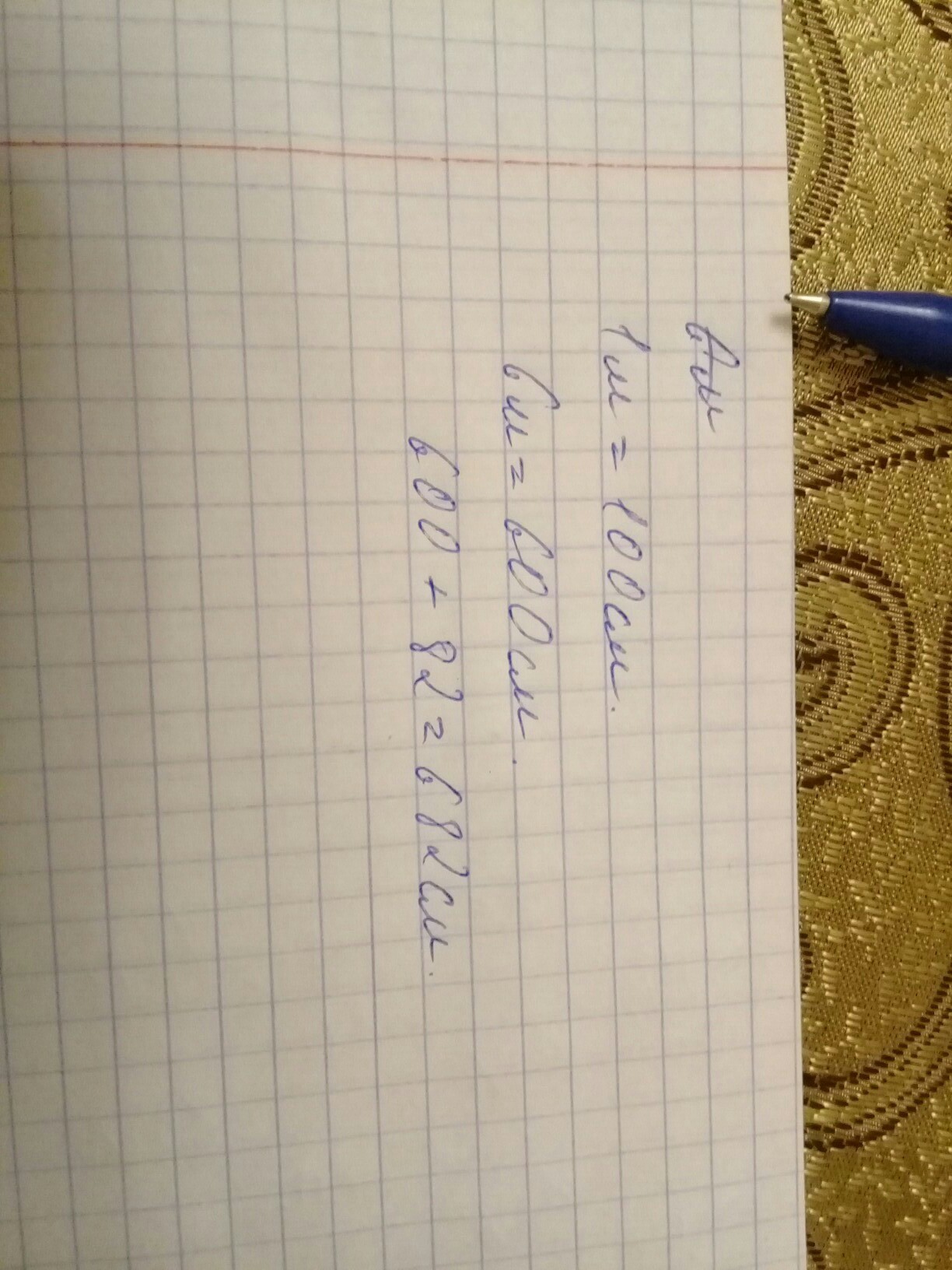 В одном метре 100 см. 6 метров это 600 см. 600 см + 82см. Это 682 см