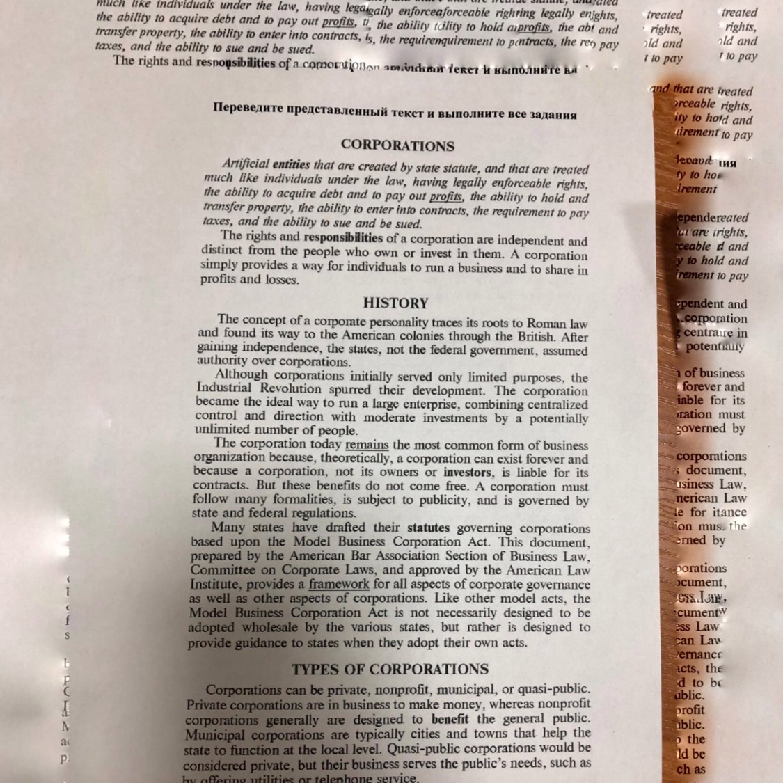 КОРПОРАЦИИ Искусственные объекты, созданные государством, и которые обрабатываются так же, как и физически закрепленные права, способность выплачивать прибыль, способность удерживать и передавать имущество, способность заключать контракты, налоги на требования и способность подавать в суд и быть поданным в суд. Права и обязанности корпорации являются независимыми. Корпорация управляет бизнесом и распределяет прибыли и убытки. Концепция корпоративной личности прослеживает свои корни в римском праве, который нашел свой путь к американским колониям через англичан. После обретения независимости государства, а не федеральное правительство, взяли на себя полномочия. Хотя корпорации первоначально выполняли лишь ограниченные цели, промышленная революция стимулировала их развитие. Корпорация - идеальный способ управлять крупным предприятием, сочетая централизованный контроль и руководство с неограниченным числом. Корпорация сегодня остается самой распространенной формой организации бизнеса, потому что теоретически корпорация может существовать навсегда и потому, что корпорация, а не ее владельцы или инвесторы, ответственный за свои контракты. Но это не происходит. Корпорация придерживается многих формальностей, подлежит гласности и регулируется государственными и федеральными нормами. Многие штаты разработали свои законы, регулирующие корпорации, на основе Закона о типовой деловой корпорации. Этот документ подготовлен Секцией делового права Американской коллегии адвокатов. Комитет по корпоративному праву и утвержденный Американским юридическим институтом, обеспечивает рамки для всех аспектов корпоративного управления, как и другие аспекты корпораций. Как и в других образцовых актах, Закон о типовой деловой корпорации не обязательно предназначен для использования оптовой торговлей различными государствами, а скорее предназначен для того, чтобы дать указания государствам, когда они принимают свои собственные действия. ТИПЫ КОРПОРАЦИЙ Корпорации могут быть частными, некоммерческими, муниципальными или квазипубличными. Частные корпорации в бизнесе зарабатывают деньги, тогда как некоммерческие