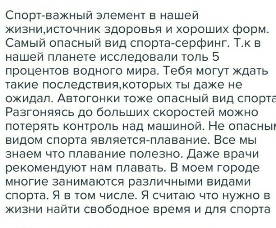 Sport is an important element in our life, a source of health and good forms. The most dangerous sport is surfing, as only 5 percent of the water world explored in our planet. You can wait for such consequences, which you did not even expect. Auto racing is also a dangerous sport. Accelerating to high speeds can lose control of the car. Not a dangerous sport is - swimming. We all know that swimming is helpful. Even doctors recommend us to swim. In my city, many are engaged in various sports. Including me. I think that it is necessary to find free time in life for sports