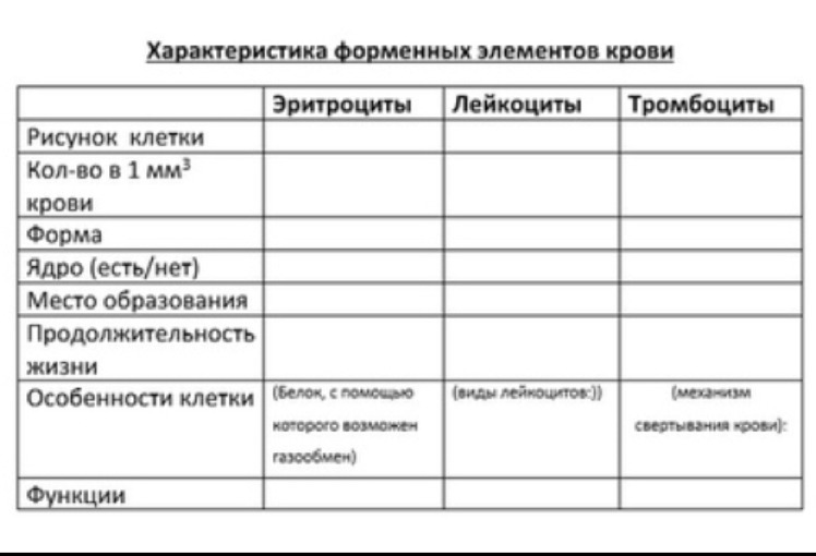 Лейкоциты: 4-9 тыс. в 1 мм³; форма: бесцветные кровяные клетки разной формы; место образования: красный костный мозг, лимфатические узлы; продолжительность жизни: несколько дней; функция-защитная.