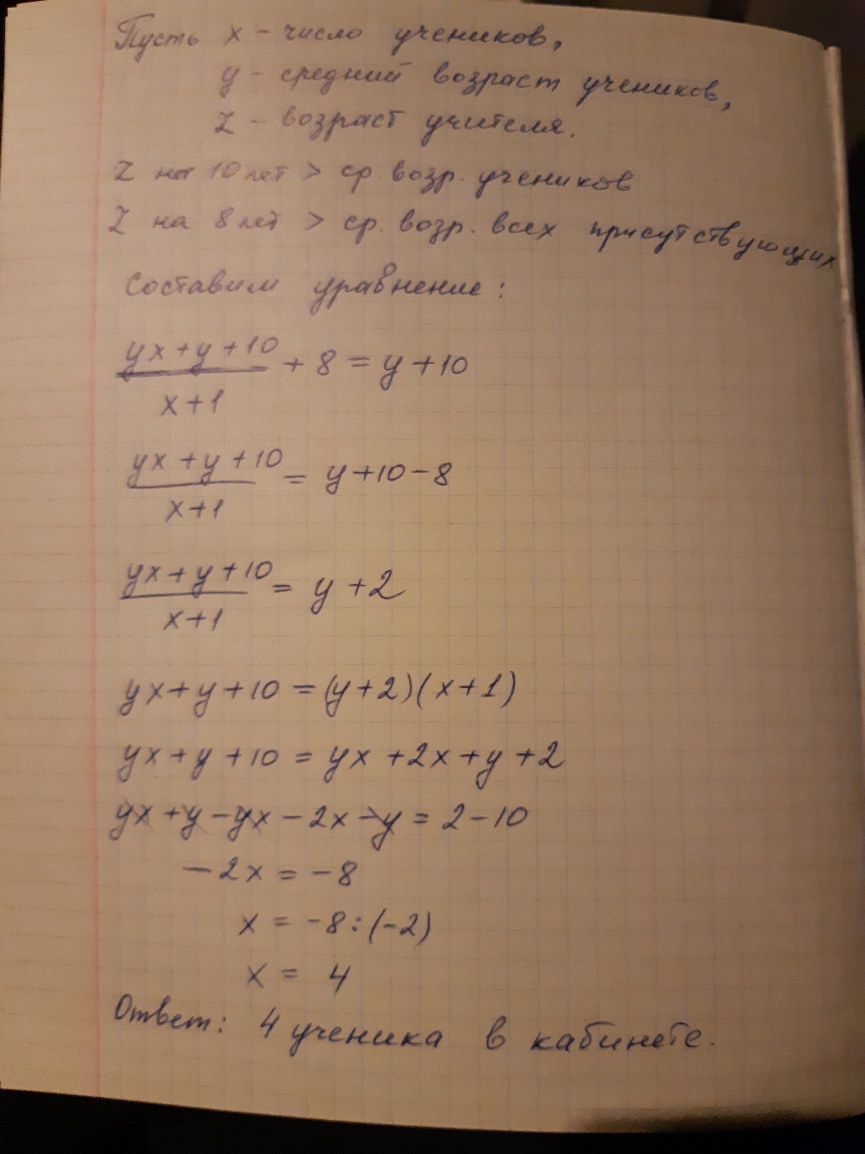 В кабинете находятся учитель и несколько учеников. Возраст учителя на 10 лет больше среднего возраста учеников и на 8 лет больше среднего возраста всех присутствующих. Сколько учеников в кабинете? Ответ в задании должен быть целым числом.