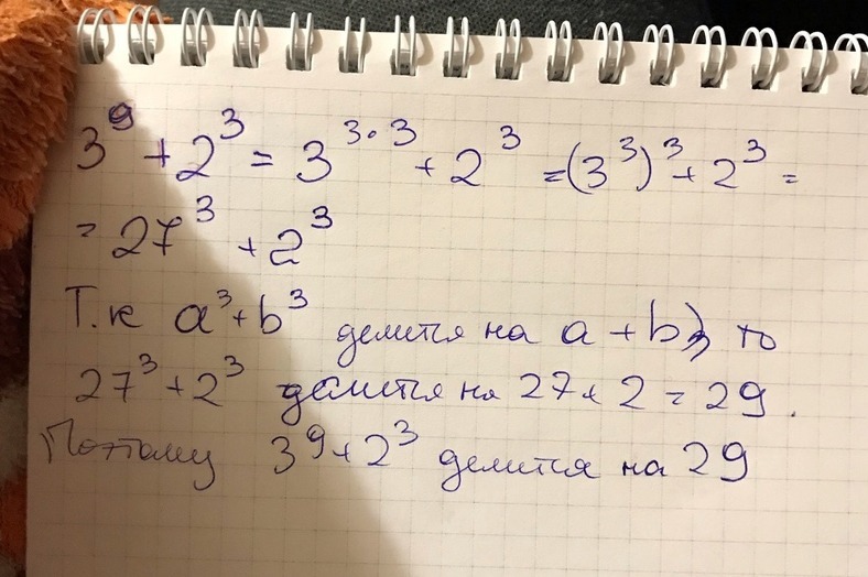 Как довести, что 3 в 9й степени + 2 в 3й степени нацело делиться на 29