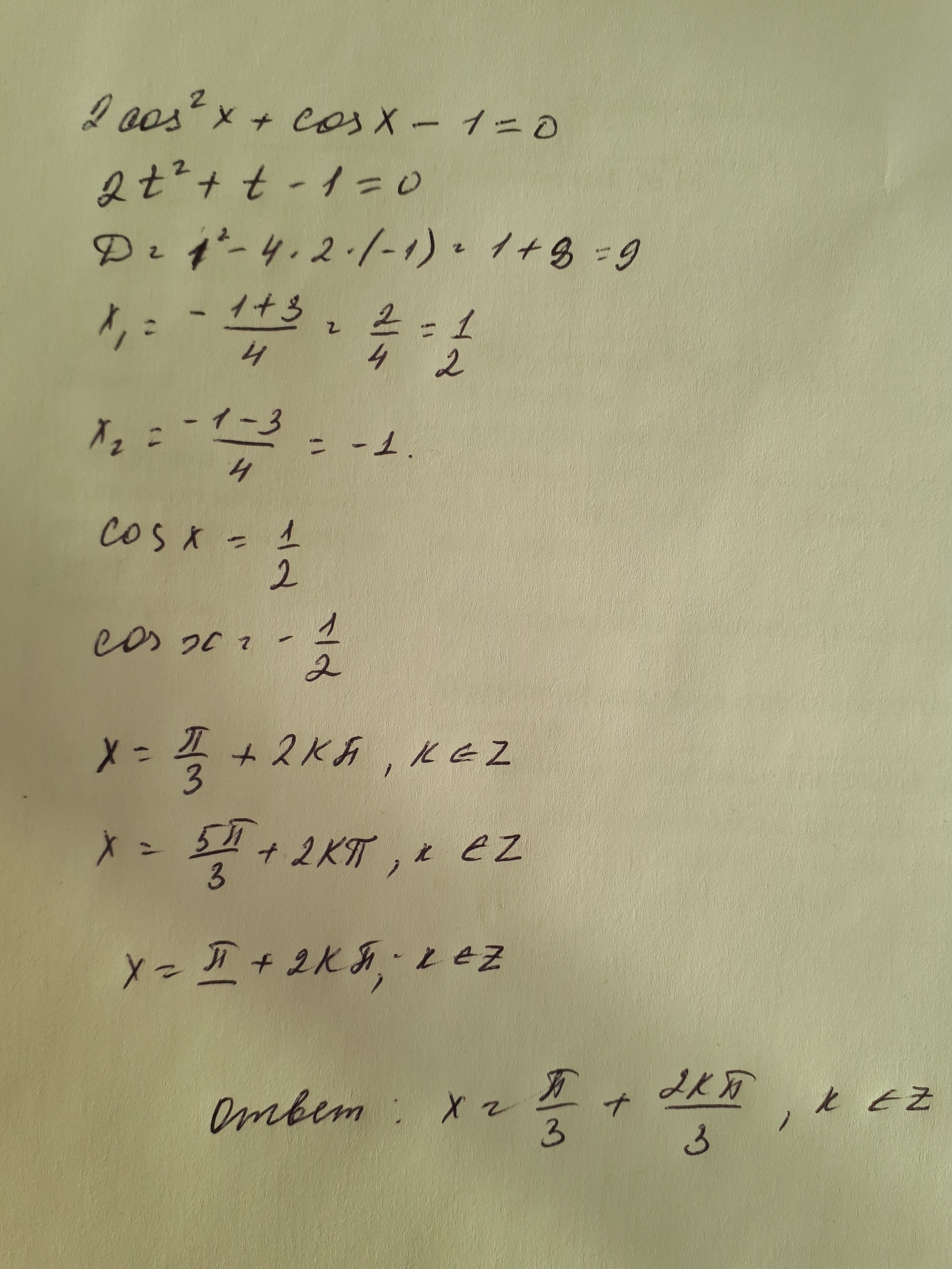 Решите тригонометрическое уравнение 2сos²x+cosx-1=0