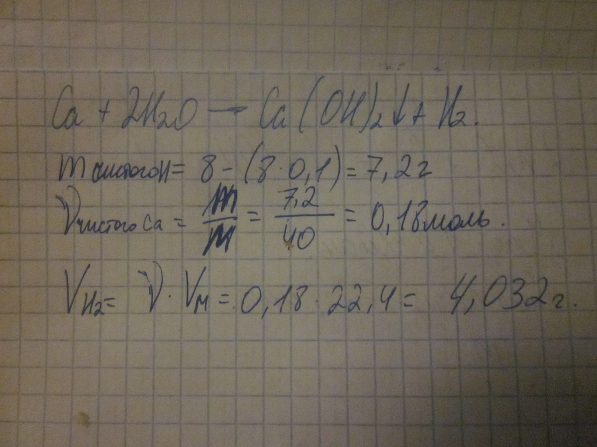 Найти объем водорода,который образуется при взаимодействии 8 грамм кальция содержащего 10%примесей с водой.