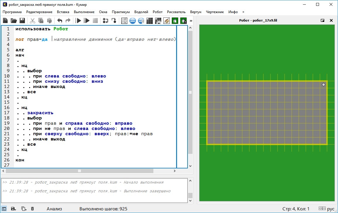 А если робот стоит в любом другом углу, этот цикл тоже можно убрать, изменив при этом соответствующим образом направления движения робота в программе.
