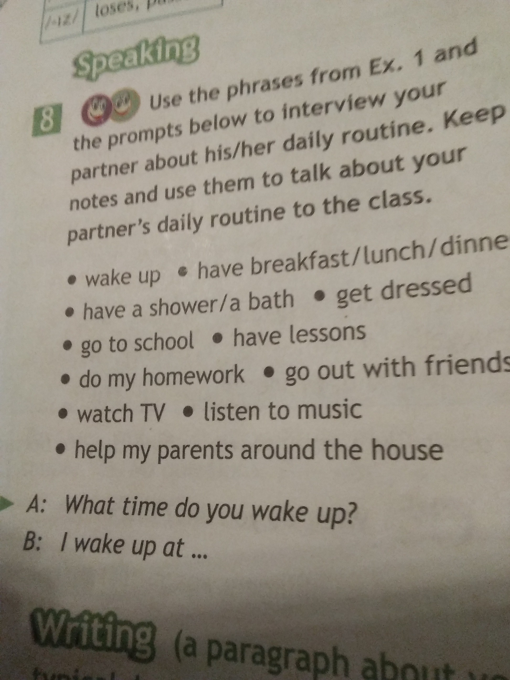 In the morning I get up to go to school. There I communicate with my classmates and solve the task at the blackboard. I try to get good grades. I have many friends at school with whom I communicate. After school I go home and do homework. After that I go to the gym .video with workout play computer and go to bed.