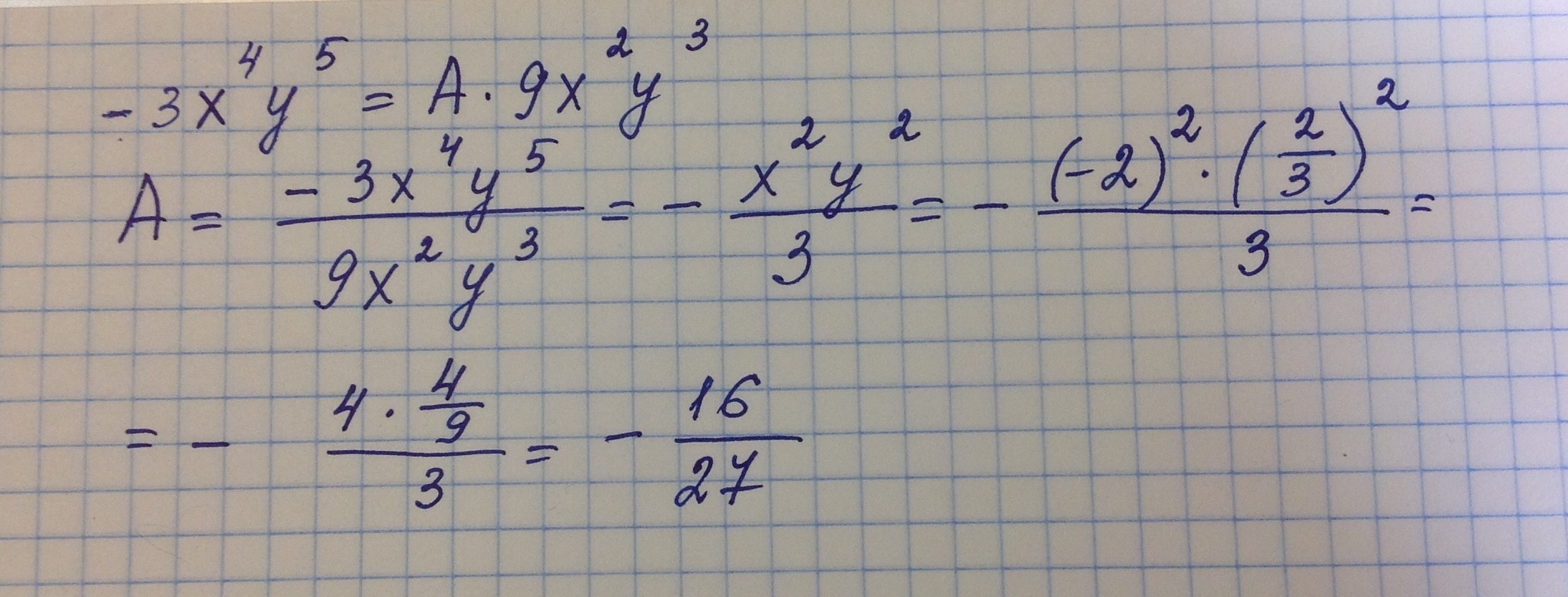 task/30674911 Найти значение выражения A,если - 3x⁴y⁵ = A9x²y³ при x = - 2 , y = 2/3 .