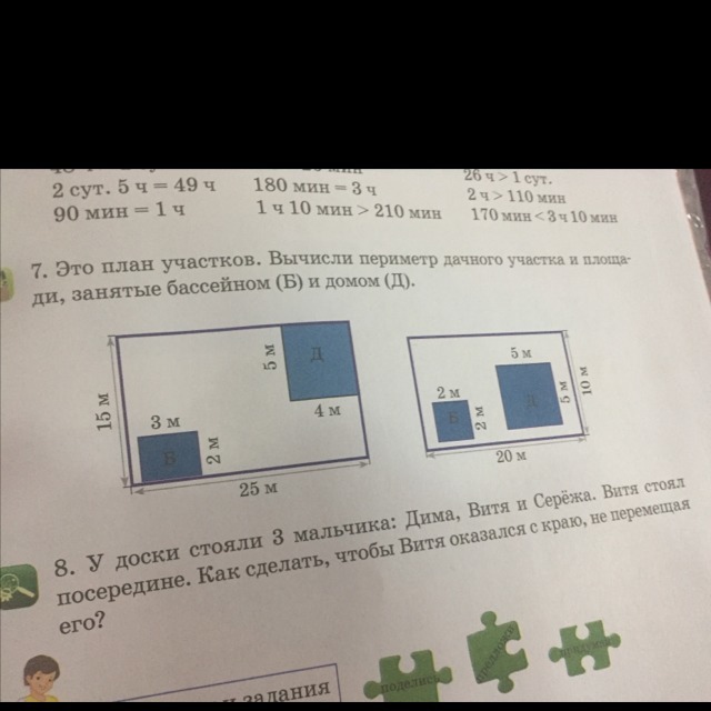 площадь равна произведению двух сторон. Значит на первом рисунке площадь бассейна 3*2=6(кв. м), а площадь дома 4*5=20(кв.м)