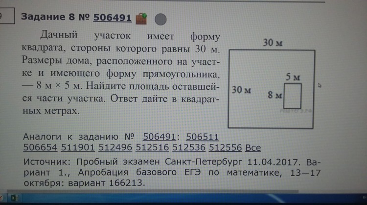 Площадь квадрата равна квадрату его стороны, поэтому площадь участка равна 30 · 30=900 кв.м. Площадь прямоугольника равна произведению его длины на ширину, поэтому площадь дома равна 8 · 5=40 кв.м. Тем самым, площадь участка, незанятого домом равна 900-40=860 кв.м.
