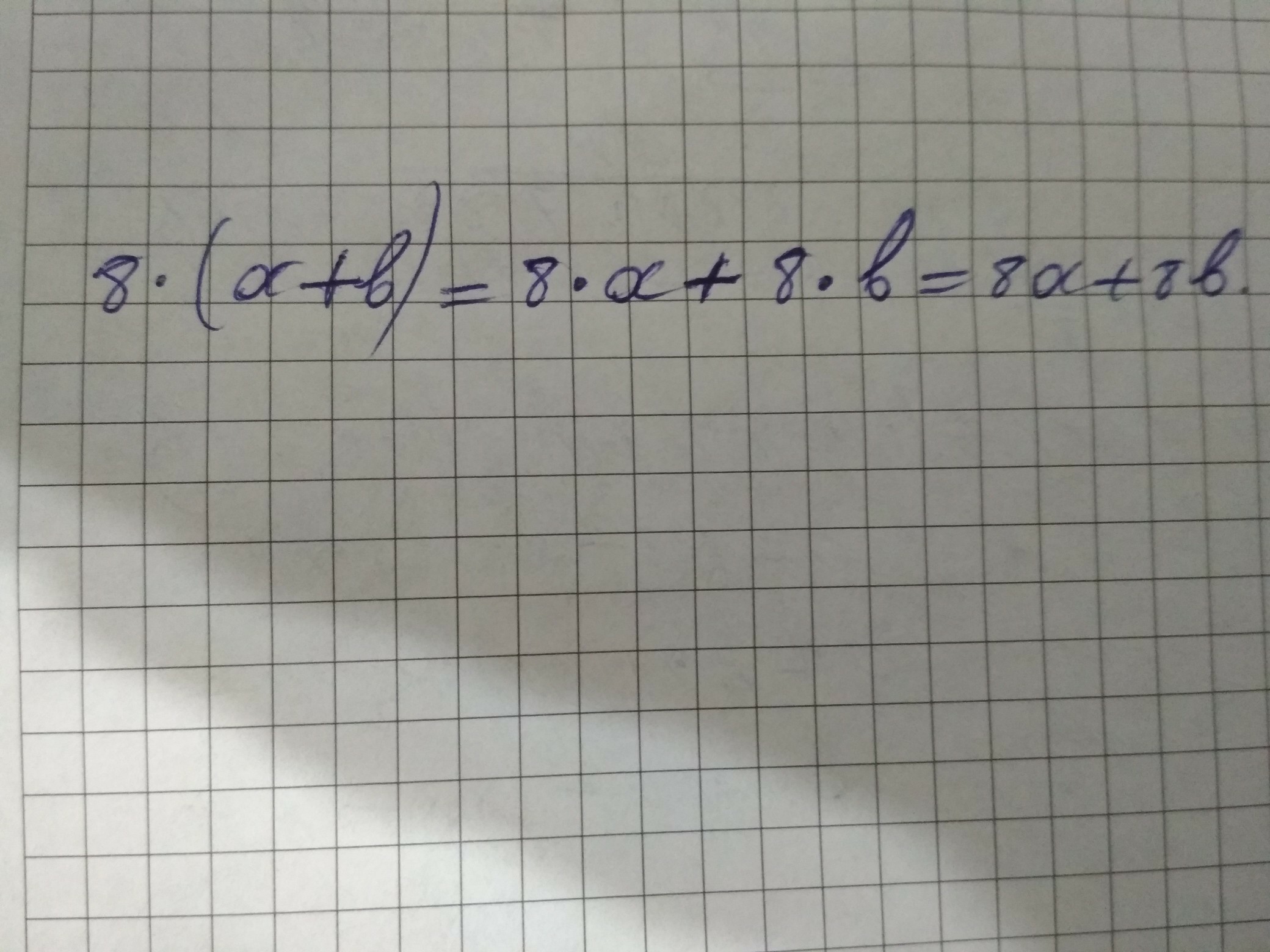 Запиши утверждение на математическом языке: для того чтобы умножить число 8 на сумму двух чисел a и b , можно умножить на это число каждое слагаемое и полученные результаты сложить. Ответ (в скобках буквы записывать в алфавитном порядке): ⋅( )= ⋅ ⋅ .
