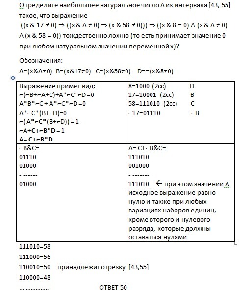 Определите наибольшее натуральное число A из интервала [43, 55] такое, что выражение ((x & 17 ≠ 0) ⇒ ((x & A ≠ 0) ⇒ (x & 58 ≠ 0))) ⇒ ((x & 8 = 0) ∧ (x & A ≠ 0) ∧ (x & 58 = 0)) тождественно ложно (то есть принимает значение 0 при любом натуральном значении переменной x)?