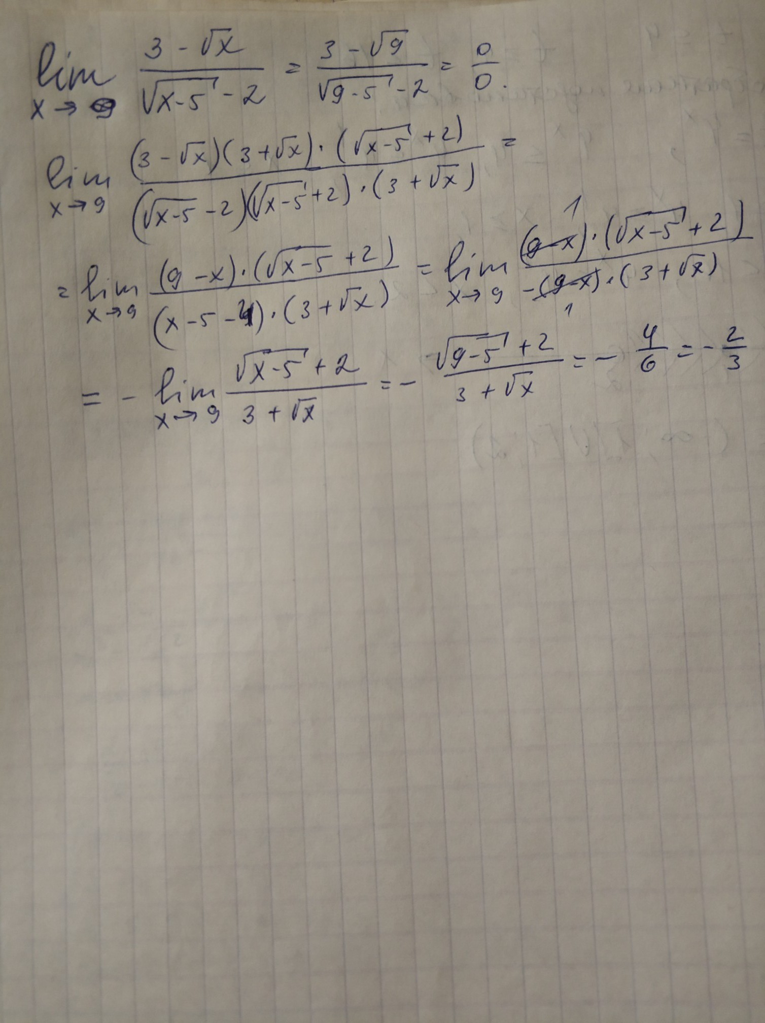 Домножал на сопряженный множитель числитель и знаменатель, и все равно при подстановке 9 получается [0/0]