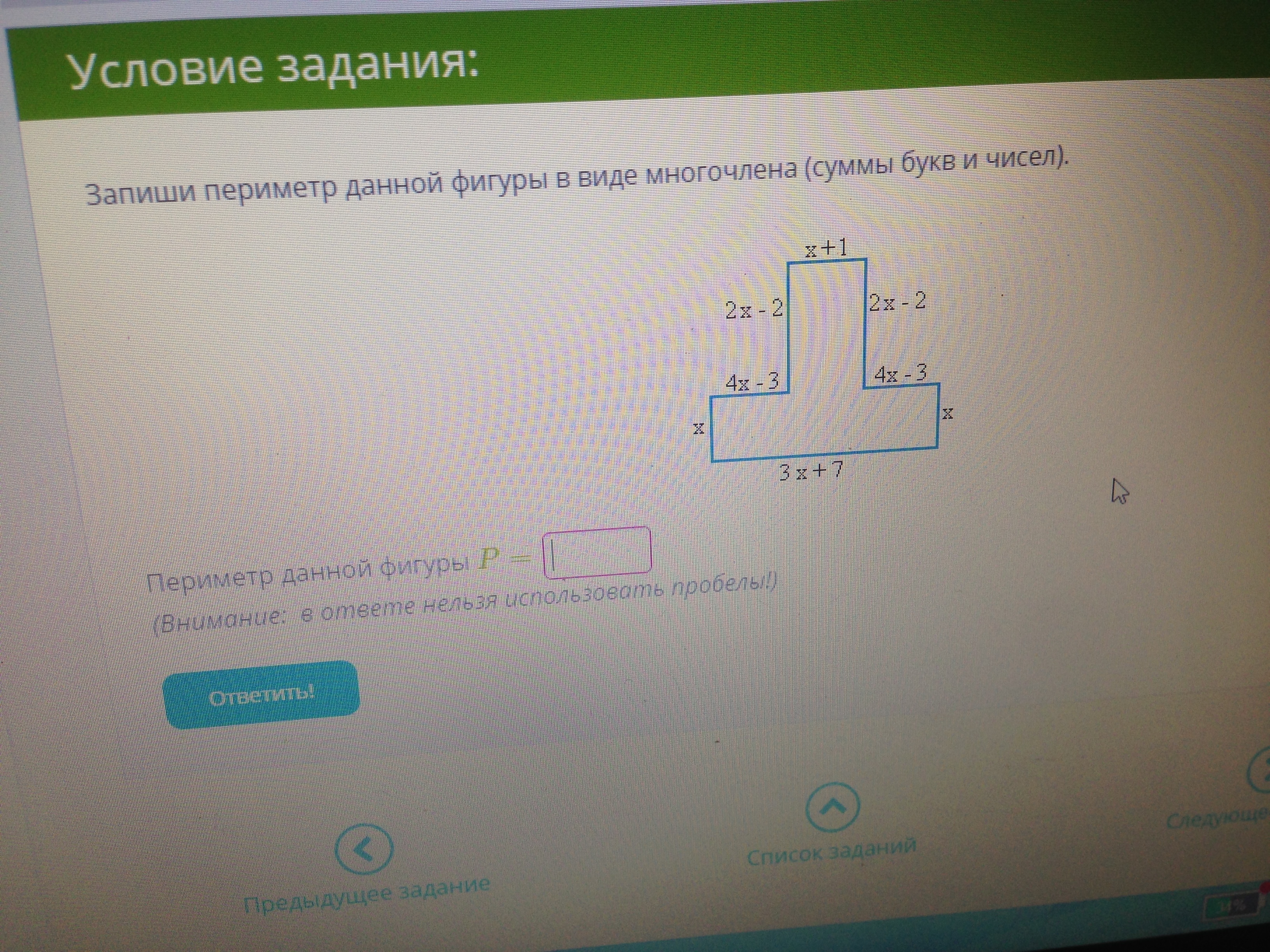 P=(x+1)+(2x-2)+(2x-2)+(4x-3)+(4x-3)+x+x+(3x+7)= x+1+2x-2+2x-2+4x-3+4x-3+x+x+3x+7=18x-2