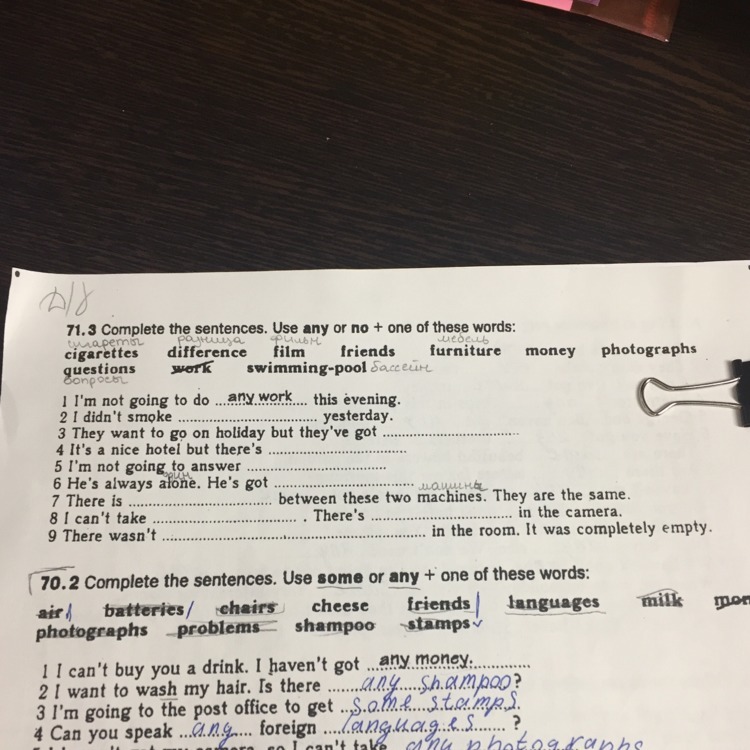 2 any cigarettes 3no money 4no swimming pool 5any questions 6no friends 7no difference 8any film, no photographs 9any furniture