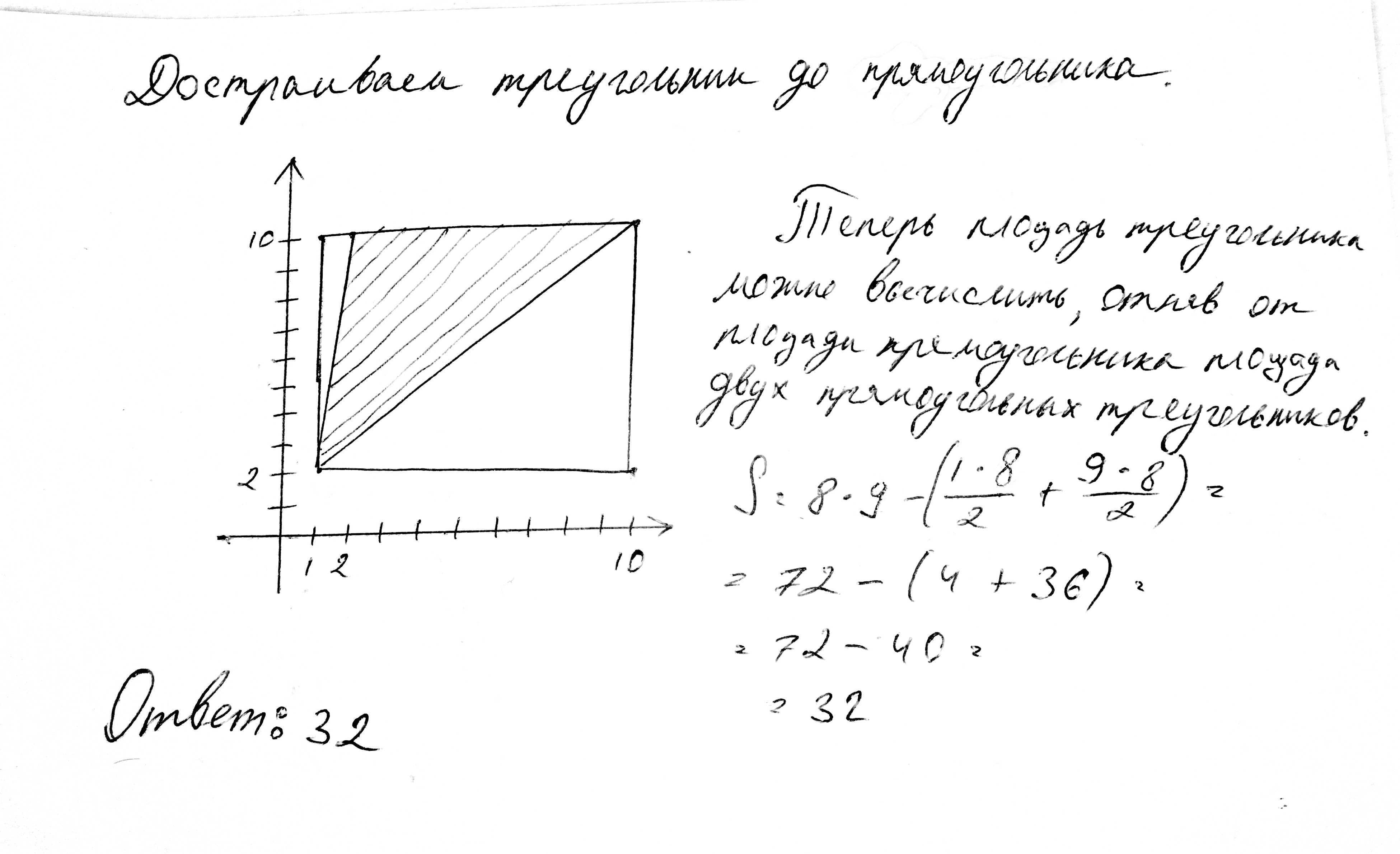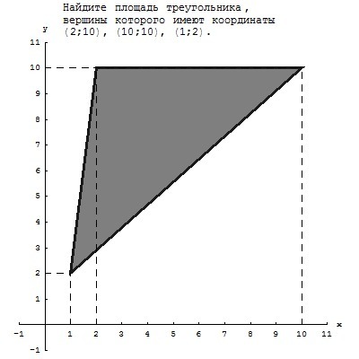 Найдите площадь треугольника, вершины которого имеют координаты (2;10), (10;10), (1;2).
