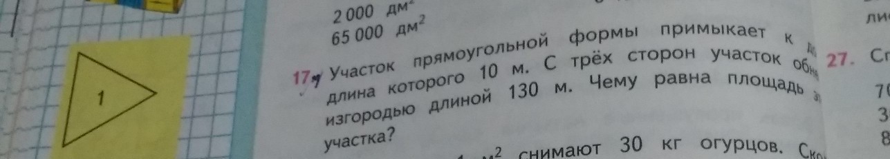 Плохо видно на сгибе, но судя по всему одна из сторон этого прямоугольника равна 10 м. Тогда длина другой стороны равна (130 - 10) / 2 = 60 м. Откуда площадь участка равна 10 * 60 = 600 м2