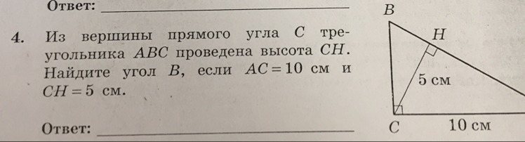 Так как треугольник CHA прямоугольный и катет СH равен половине гипотенузы AC, то исходя из свойства прямоугольного треугольника : если катет прямоугольного треугольника равен половине гипотенузы, то угол, лежащий против этого катета, равен 30º, ∠A = 30°.