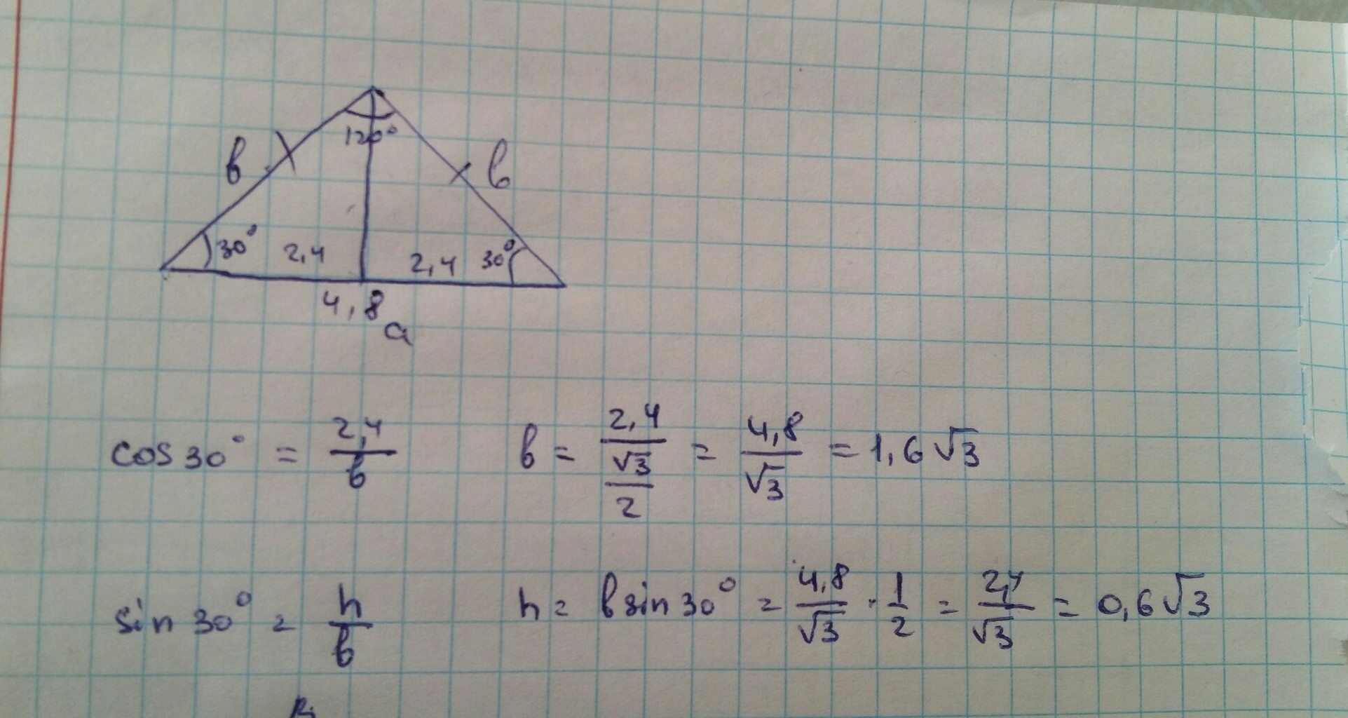 основание равнобедренного треугольника равно 4.8 а угол при основании 30°. найдите высоту и боковую сторону треугольника