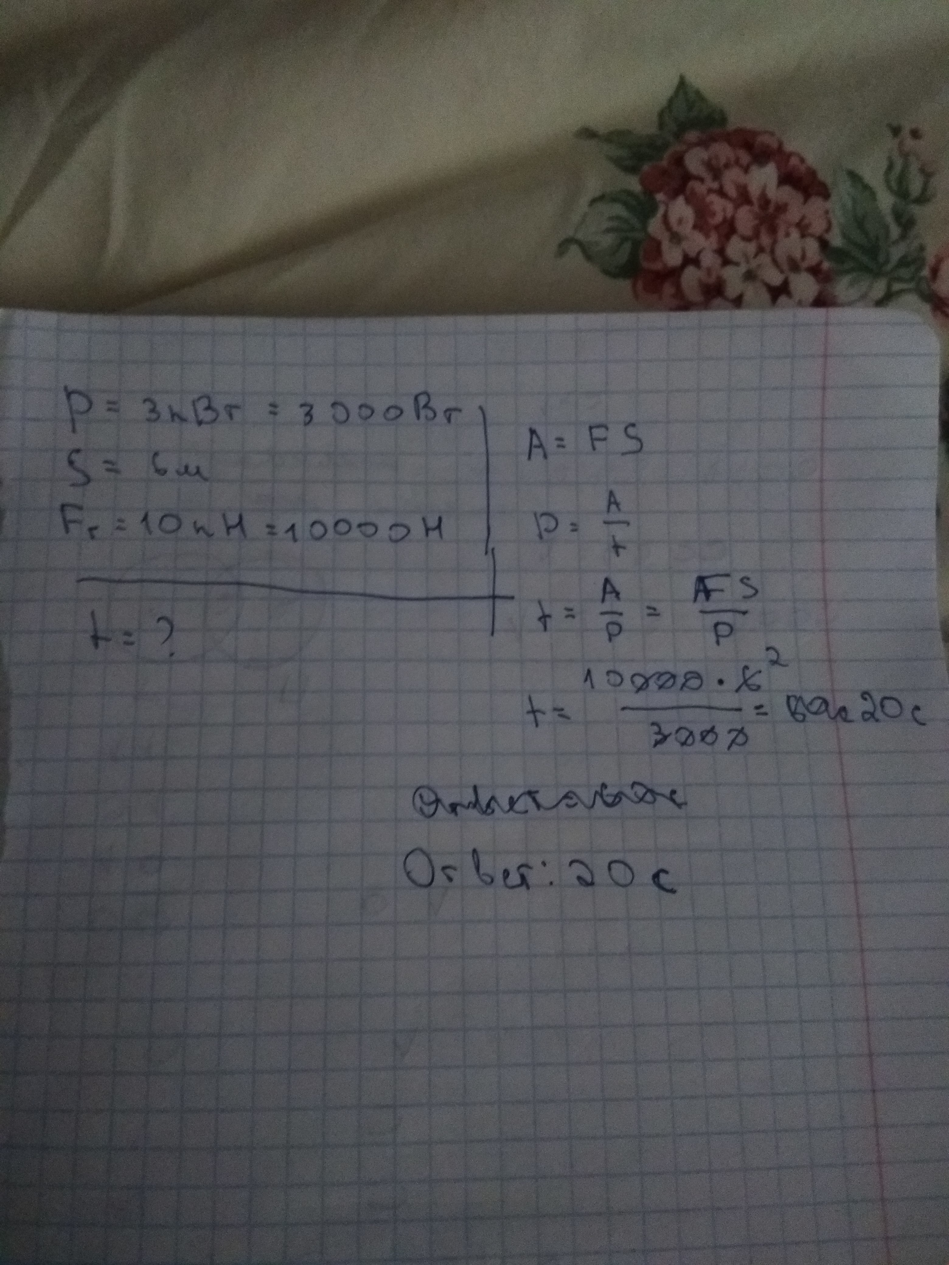 Дано: мощность 3кВт, перемещение 6м, сила тяги 10кН, движение равномерное. Определить время .