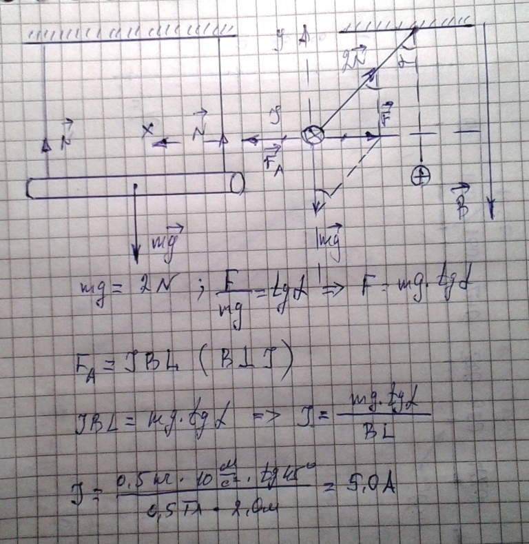 На двох нитках висить горизонтально розташований стержень довжиною 2 м и масою 0,5 кг. Стержень знаходиться в однорідному магнітному полі, індукція якого 0,5 Тл та спрямована вниз. Який струм необхідно пропустити по стержню, щоб нитки відхилились від вертикалі на 45°?