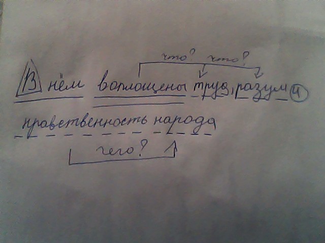 Синтаксический разбор предложения: В нём воплощены труд, разум, воля и нравственность народа. ( со скобками)