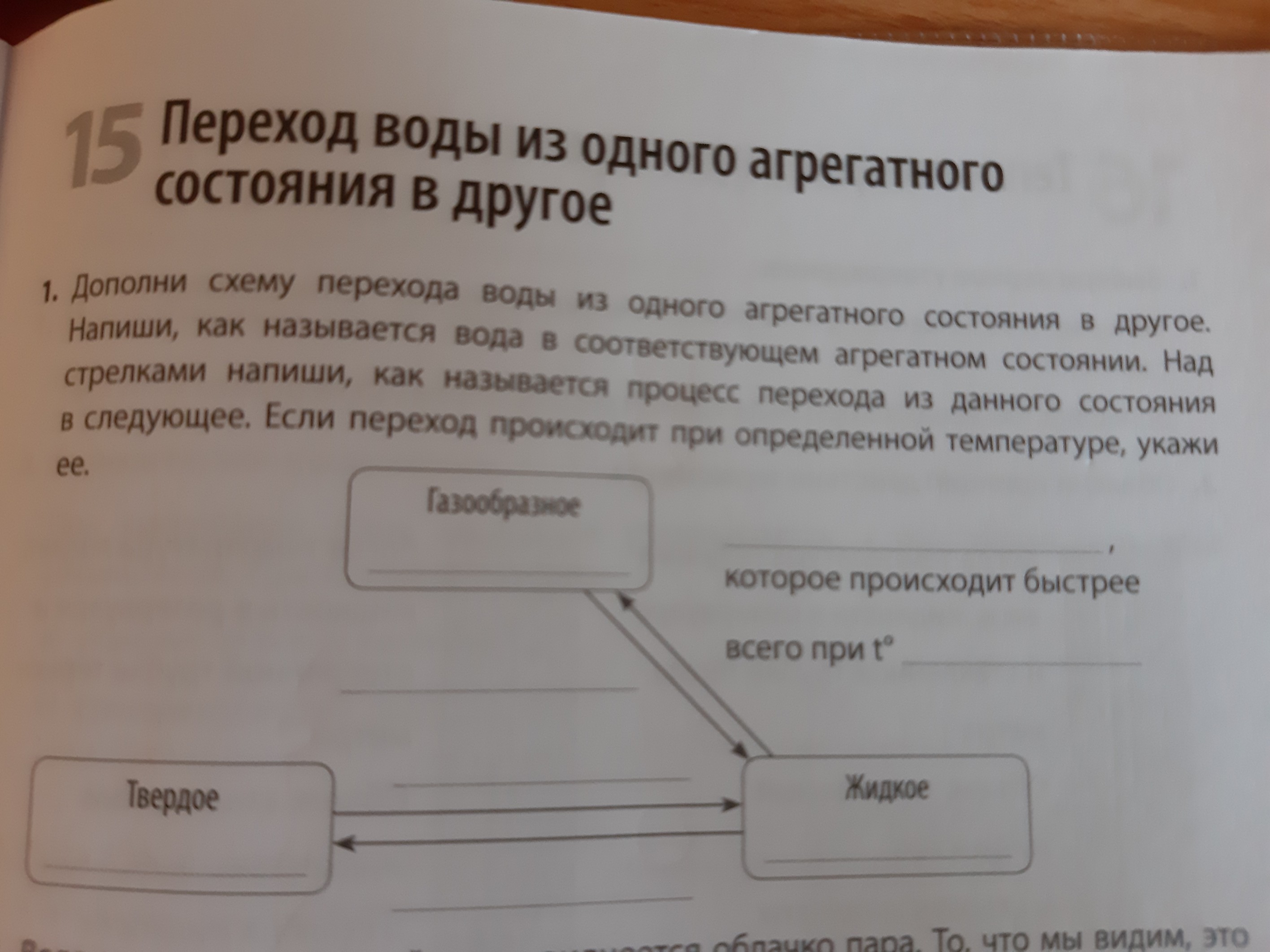 Твёрдое - лёд, газообразное - пар, жидкая - вода. Чтобы превратить из жидкого в газообразное, нужна высокая температура, или как горячая вода, когда мы моем посуду, около 40-50° и более, а вот чтобы превратить жидкость в твёрдое состояние, то бишь в лёд, нужна низкая температура, наверное от 0° и до любого минуса.