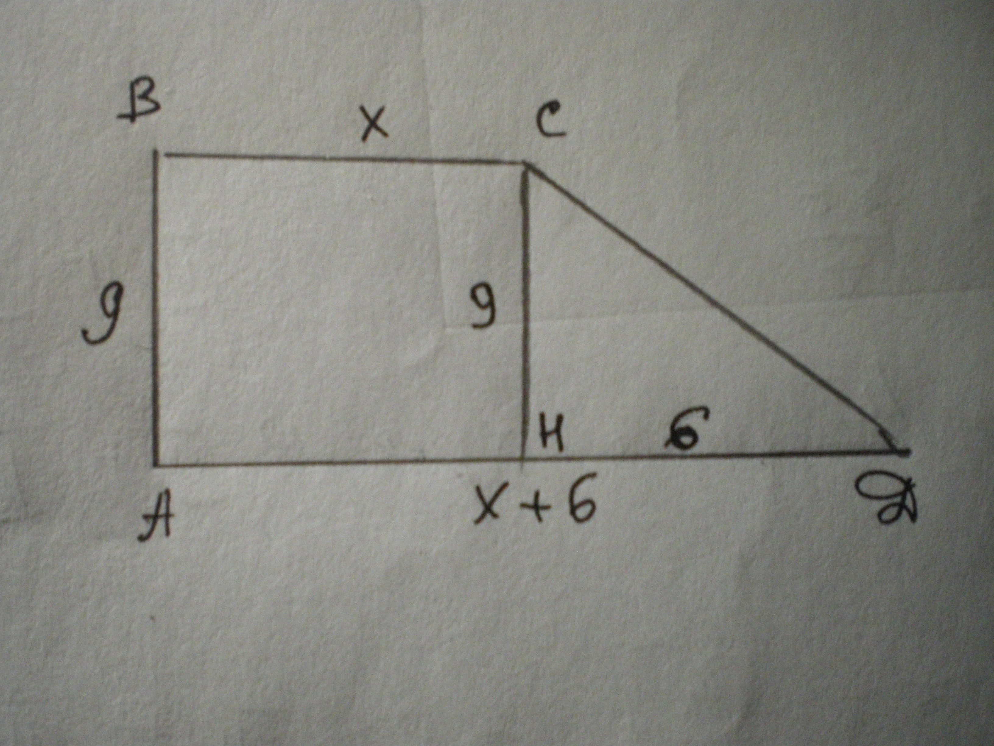 Пусть меньшее основание ВС=х см, тогда большее основание АД=х+6 см. Высота АВ=СН=9 см.
