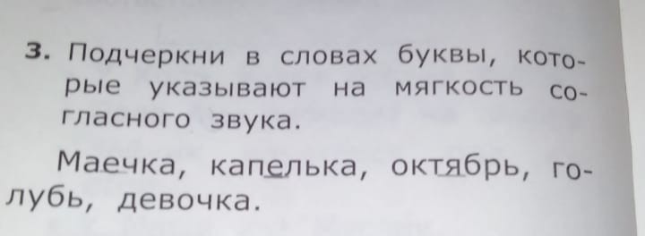 подчеркни в словах буквы, которые указывают на мягкость согласного звука : маечка , капелька, октябрь, голубь , девочка.