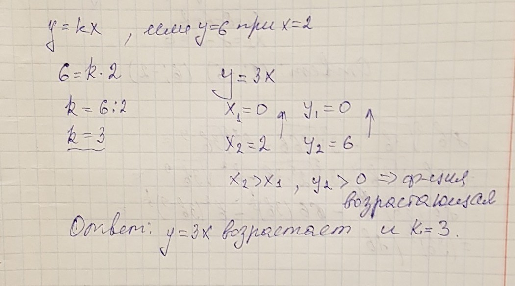 Определи значение коэффициента k и выясни, возрастает или убывает линейная функция y=kx, если y=6 при x=2.
