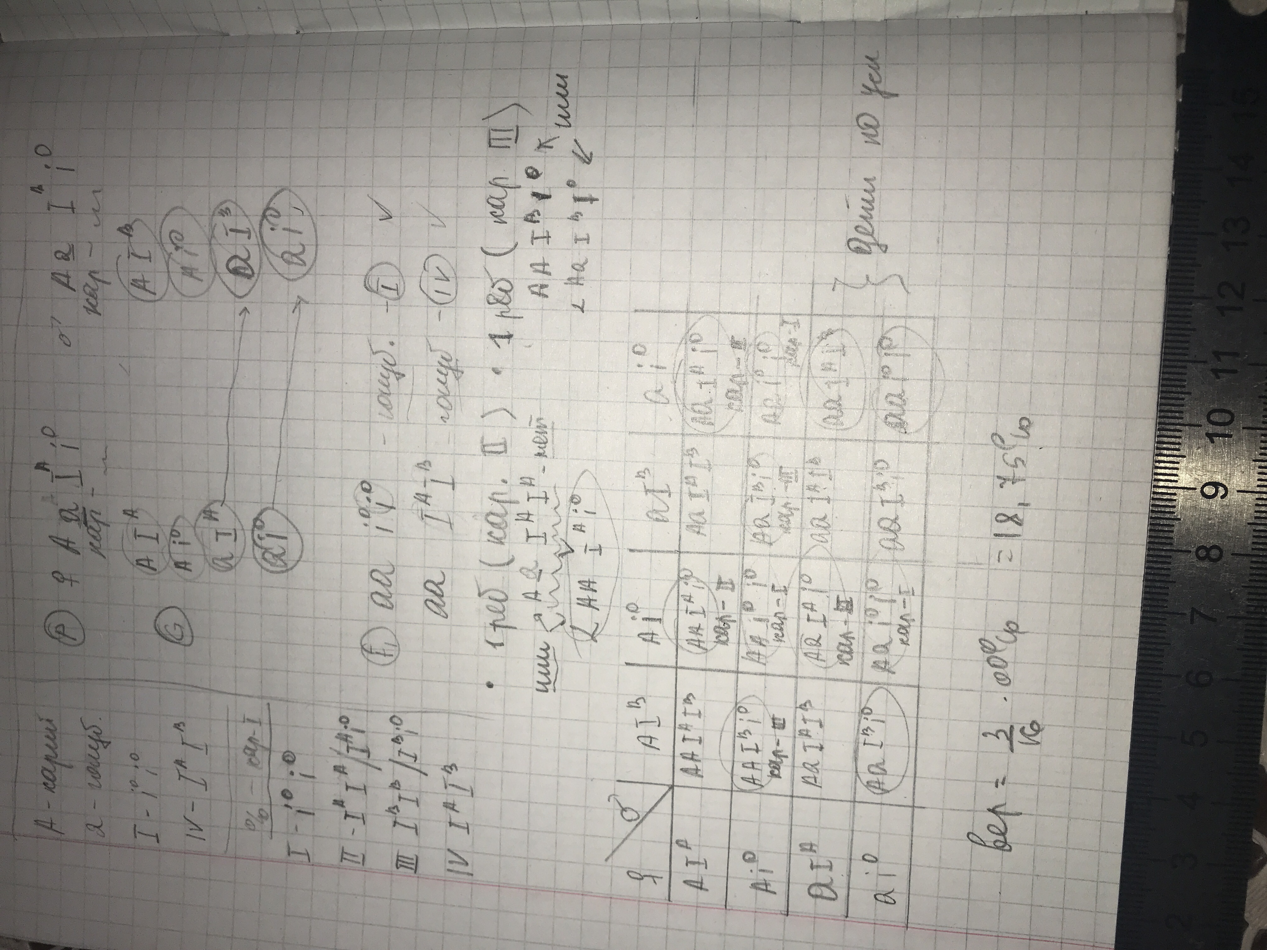 Нас спрашивают какова вероятность рождения ребёнка кареглазого с 1 группой крови, значит он может иметь генотип либо Ааii , либо ААii. Ищем такие генотипы в таблице. Их оказалась 3. Всего генотипов 16. Для того чтобы найти вероятность, мы 3/16 и умножаем на 100%.