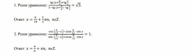 cos(π/12+x )/ sin(π/12+x ) = 1 ⇔ ctg(π/12+x) = 1 ⇔π/12+x= π/4 +πn , n∈ ℤ