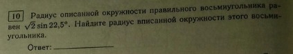 теперь радиус вписаного круга: примерно 0.60 или √2-cos(45)×√2/2tan(45/2)