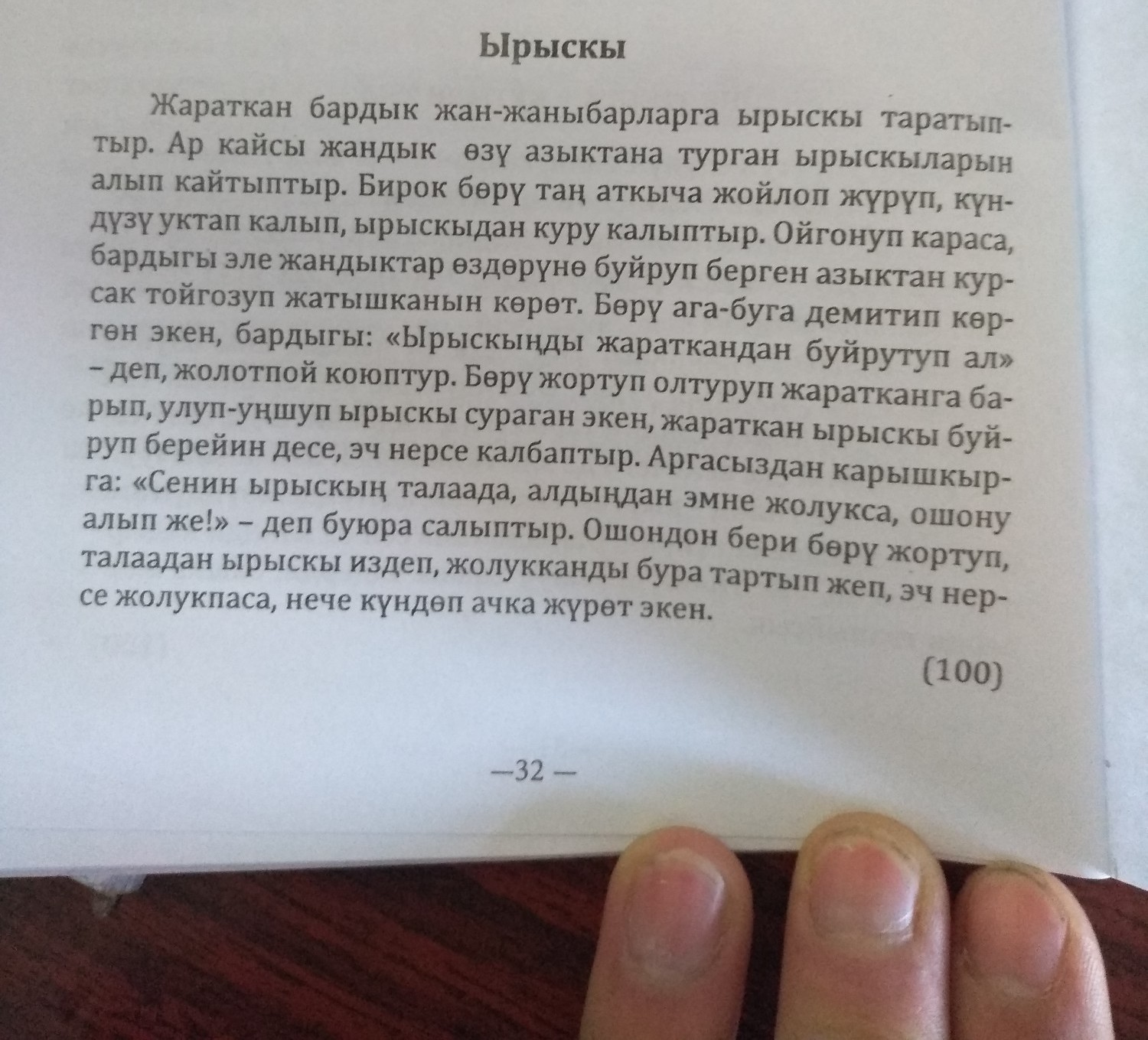 Создатель раздал всем пропитание . Каждое существо возвращался со своим пропитанием . Но волк до утра бродил , а днём уснул и остался без пропитания . Когда проснулся он увидел что все существа пропитывались тем что бог им подарил . Волк спросил у других , а они ему : " Спроси свое пропитание у создателя ! " . Он бродил и дошел до создателя , и спросил свое пропитание , а ничего не осталось то для волка ... И создатель без выбора: " ты найдешь свое пропитание на дороге своем " - сказал волку . С тех пор волк ест что ему попадается на своем пути , если ничего не продается он голодает несколько дней .