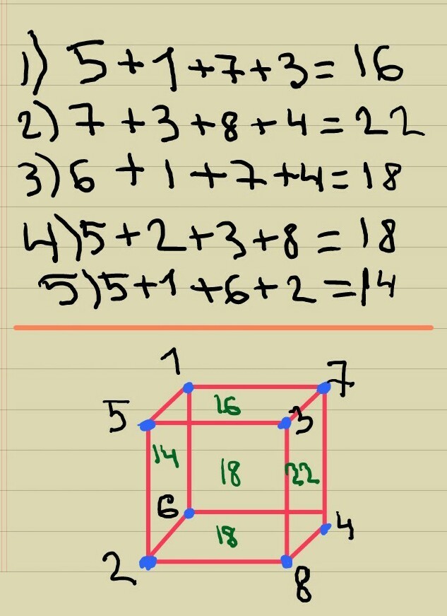 В вершинах куба мистер Фокс вписал числа от 1 до 8, каждое по одному разу. После этого он посчитал суммы чисел на каждой из шести граней. Три из этих сумм: 16, 18 и 22. Чему равна наименьшее из шести посчитанных им сумм?