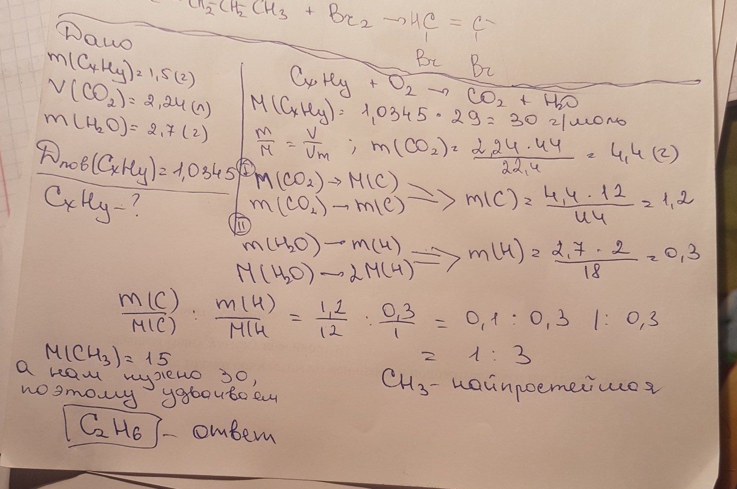 Внаслідок спалювання вуглеводню масою 1,5 г утворилися оксид карбону (ІV) об’єму 2,24 л та вода масою 2,7 г. Виведіть формулу вуглеводню, якщо відносна густина його за повітрям становить 1,0345. (Решите через Дано,чтобы все было понятно,пожалуйста)!!!!!!!!!!!!!!