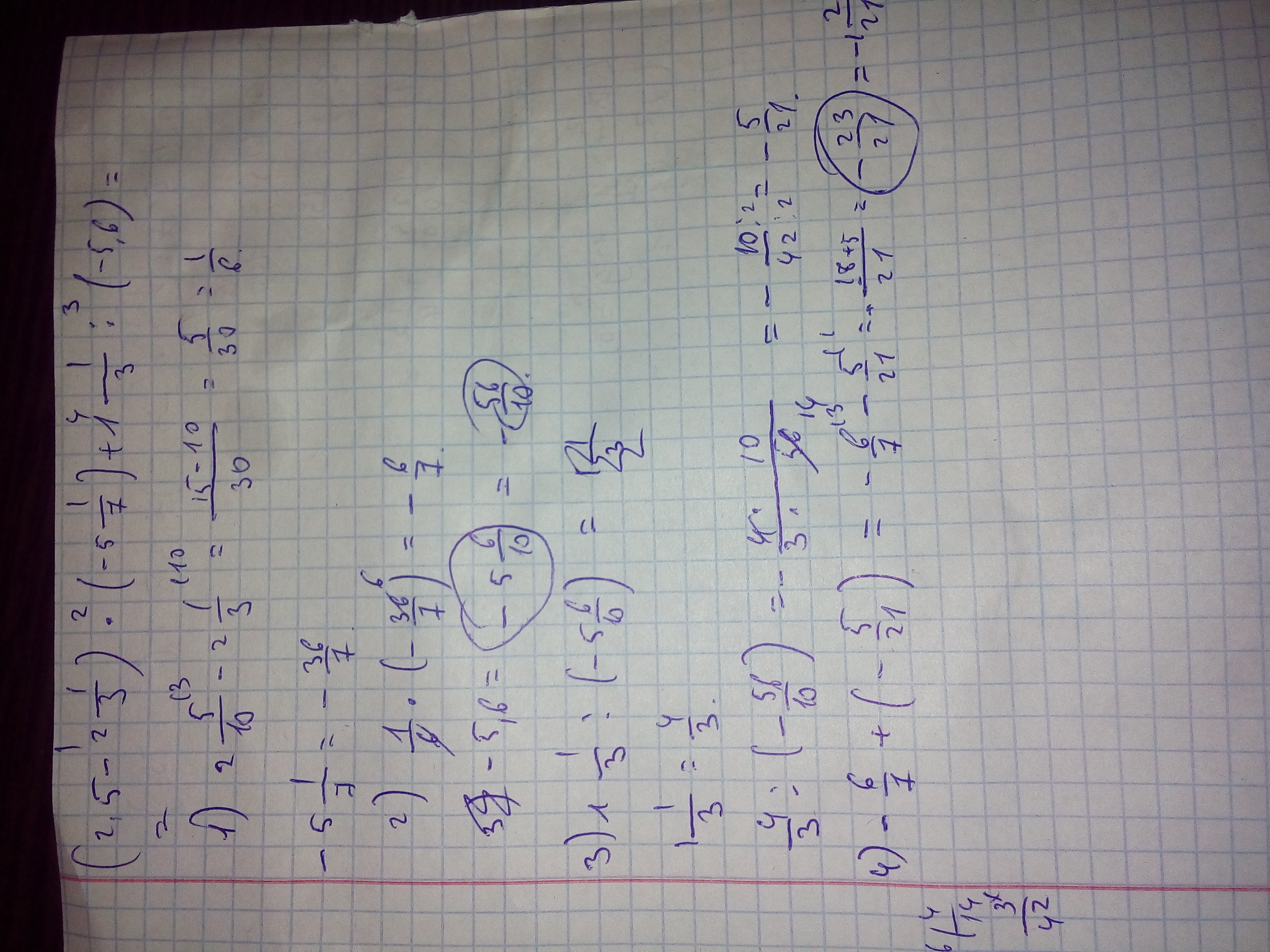 Найдите значения выражения: (2,5 - 2 целых 1/3) × (- 5 целых 1/7) + 1 целая 1/3 ÷ (-5,6) даю 30 балов!!!