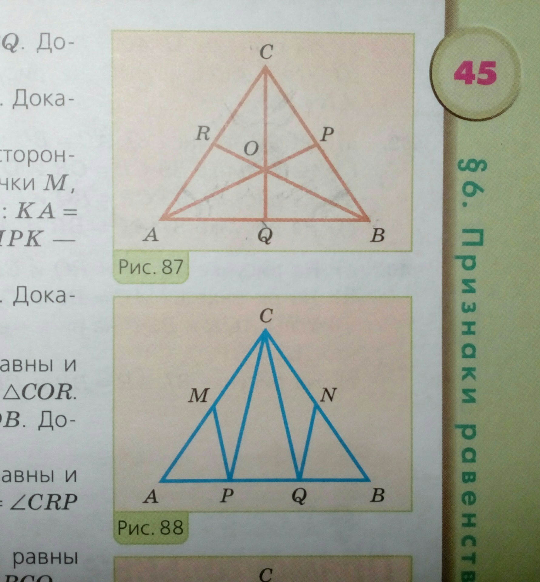б) На рисунке 87 луч CQ - биссектриса угла ACB, а луч OQ - биссектриса угла AOB. Докажите, что AC=BC