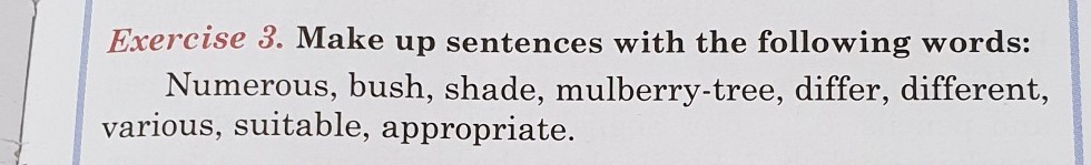 составьте предложения со словами1)numerous.2)bush3)shade4)mulberry-tree5)differ6)different7)various8)suitable9)appropriate пж помогите