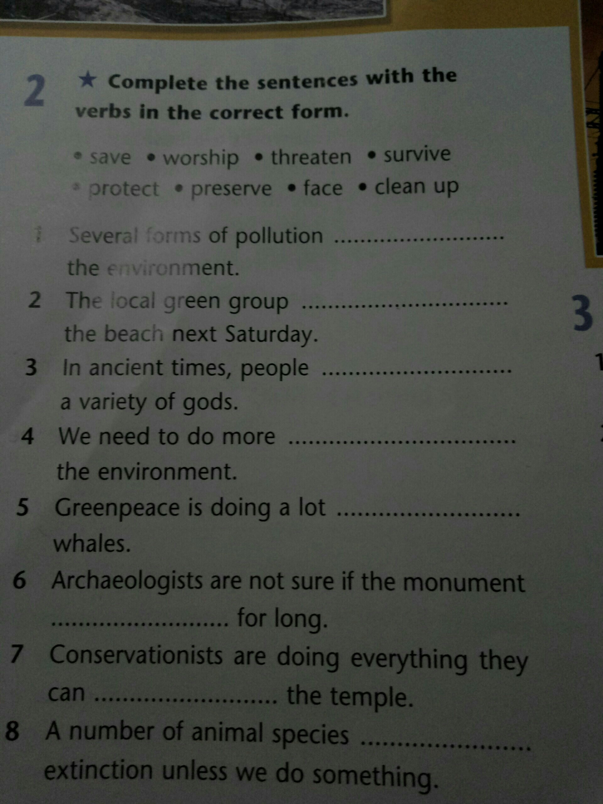 1 threaten 2 will clean up 3 worshiped 4 to save 5 to protect 6 will survive 7 preserve 8 face