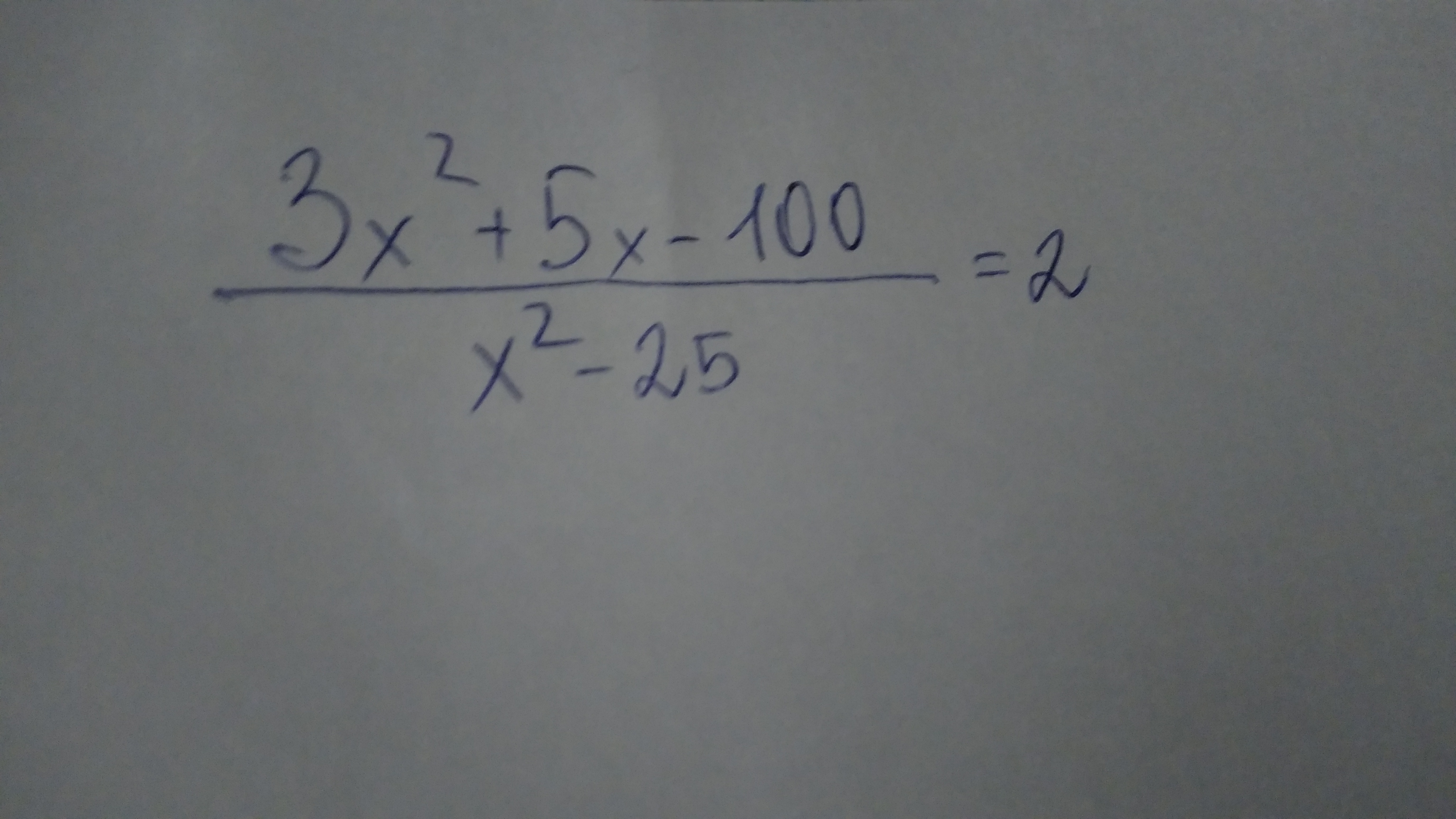 frac{3x {}^{2}  +  20x - 15 x - 100}{(x - 5)(x + 5)}  =  frac{(3x + 20)(x - 5)}{(x - 5)(x + 5) }  = 2 \  frac{3x + 20}{x + 5}  = 2 \ 3x + 20 = 2(x + 5) \ 3x + 20 = 2x + 10 \ 3x - 2x = 10 - 20 \ x =  - 10