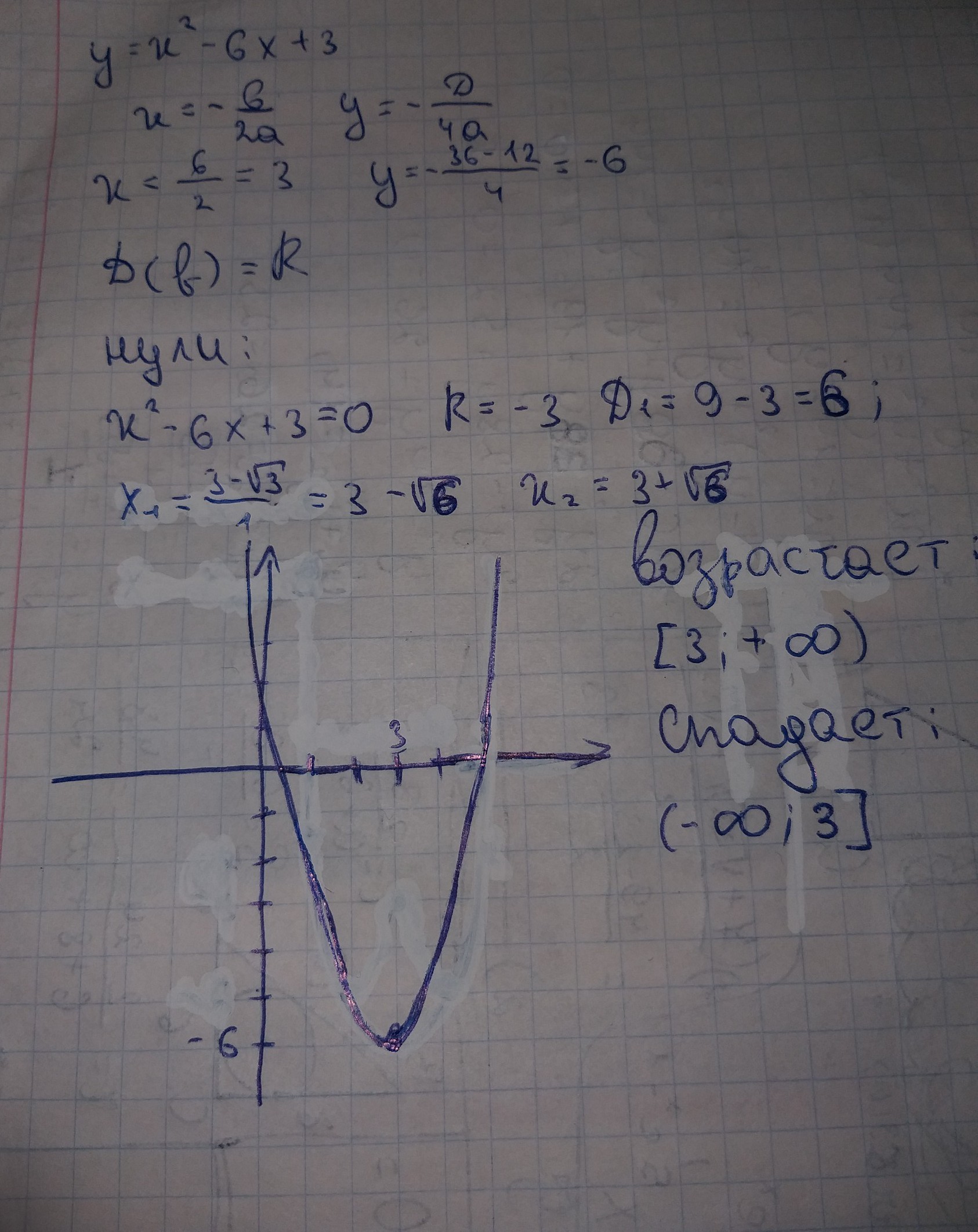 построить график функции у=х^2-6х+3.Указать координаты вершин б) область определения. в) промежутки возврастанияи убывания. г) нули функции.