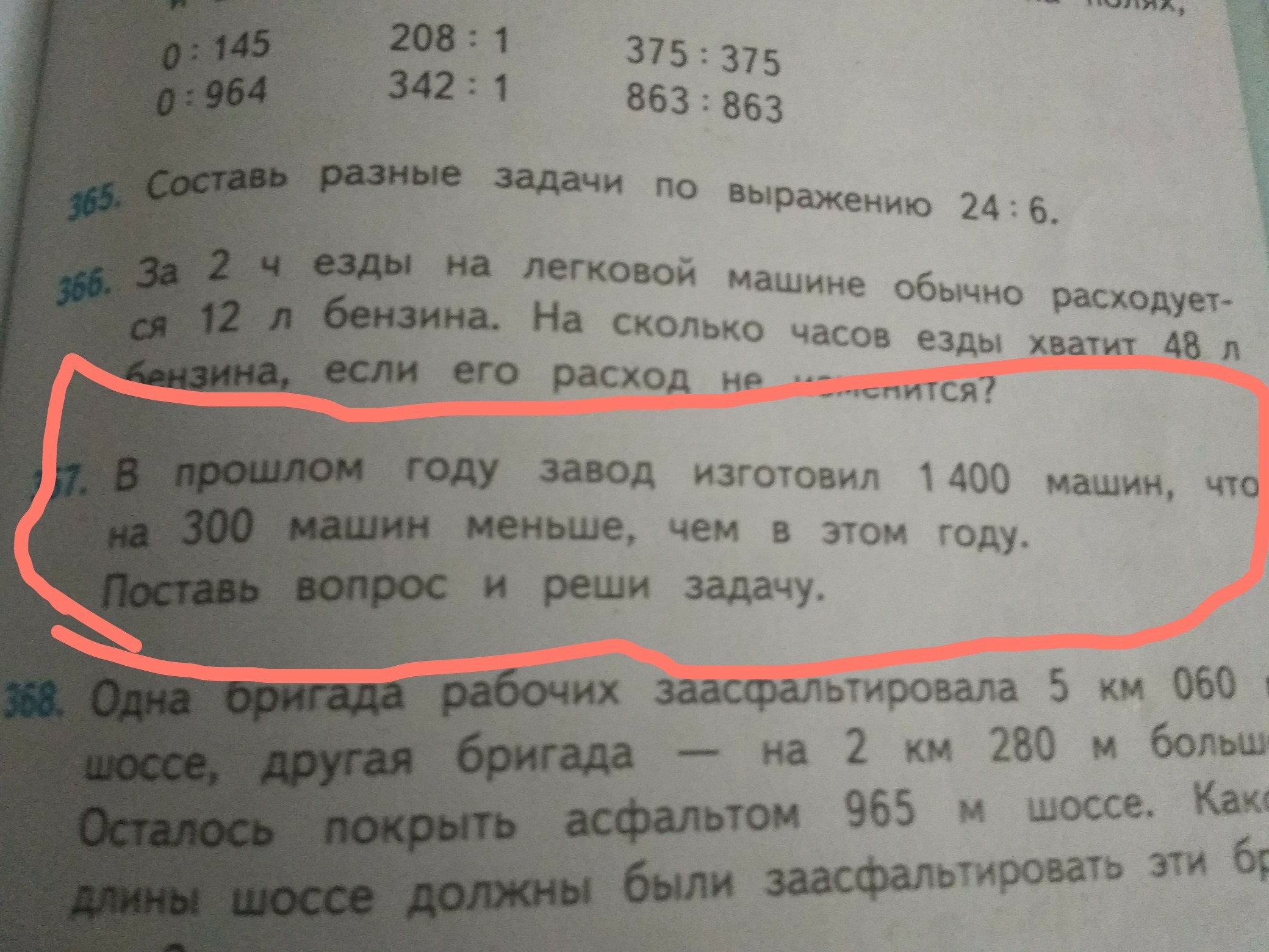 помогите пожалуйста решить задачу по математике // в прошлом году завод изготовил 1400 машин , что на 300 машин меньше чем в этом году поставь вопрос и реши задачу